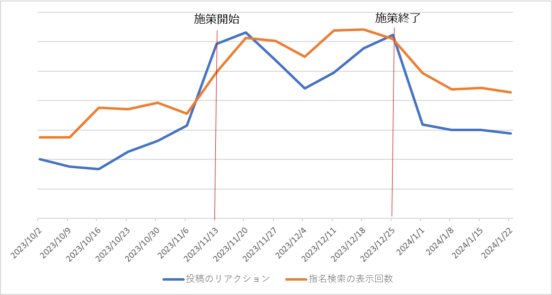 配信期間中、SNS投稿のリアクション数が大幅に増加するとともに、ブランドの指名検索表示回数も増加しました。これらの指標の上昇は売上の伸びにもつながり、認知施策の有効性が明確に示されました。