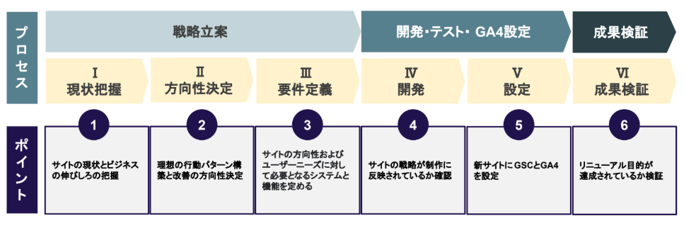 リニューアルを成功させるためには、各フェーズにおける重要なポイントを押さえる必要があります。これらのポイントを達成するためには、プロジェクト全体を通してデータ解析とSEOの視点からのアプローチが不可欠です。