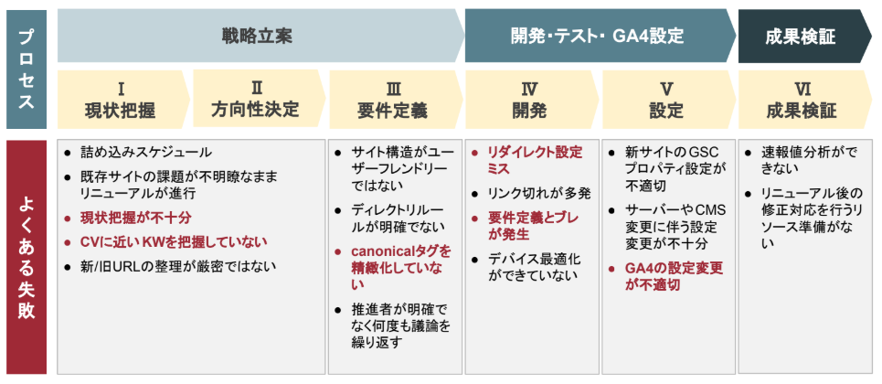 サイトリニューアルでよくある失敗とその解決策を6つご紹介いたします。弊社の実務経験に基づき、サイトリニューアルの各フェーズで頻繁に見受けられる失敗例を厳選しました。上記の図の赤字の箇所がご紹介するテーマです。