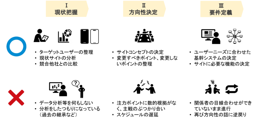 リニューアル後のサイトをどのように構築していくかを検討する前に、現状を正確に把握することが極めて重要です。弊社では、戦略策定のフェーズとして「I.現状把握」「II.方向性決定」「III. 要件定義」の3段階を設定しております。