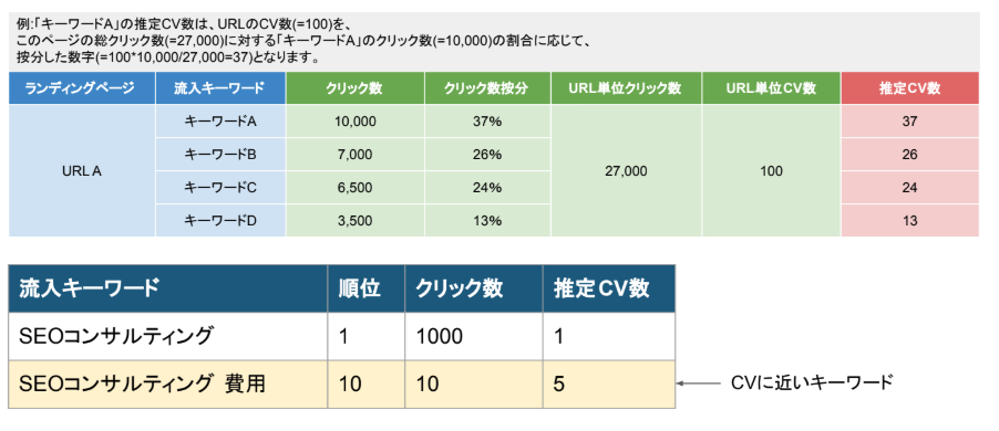 例えば、下記の表のキーワードAのコンバージョン数を算出する場合、100×10,000÷27,000=37(URL単位CV数×クリック数÷URL単位クリック数)という計算式で値が導出されます。