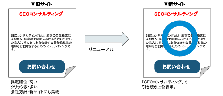 このような失敗を避けるためには、現行サイトのキーワードマーケティング調査を徹底し、既存サイトでコンバージョンを獲得しやすいキーワードを特定して新しいサイトに必ず反映させることが重要です。