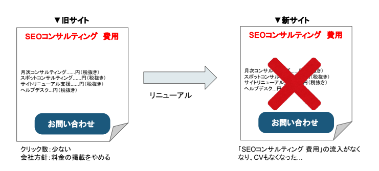 例えば、会社の方針で「料金」に関する情報を載せなくなった場合、リニューアルチームは、流入が少ないという理由で「SEOコンサルティング費用」のようなキーワードのページを廃止してしまうかもしれません。しかし、後々このページのCV率が非常に高いと判明した場合、貴重な顧客獲得の機会を失ってしまっていることになります。
