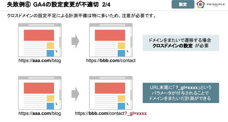 1つ目は、ドメイン・ディレクトリ構造の変更に伴うGA4側の計測設定の不備です。ドメインごと変更した場合、GA4の設定を適切に変更しなければ、正確なデータ計測ができません。クロスドメインの場合は、設定不足による計測不備が特に多い傾向にあるので注意が必要です。