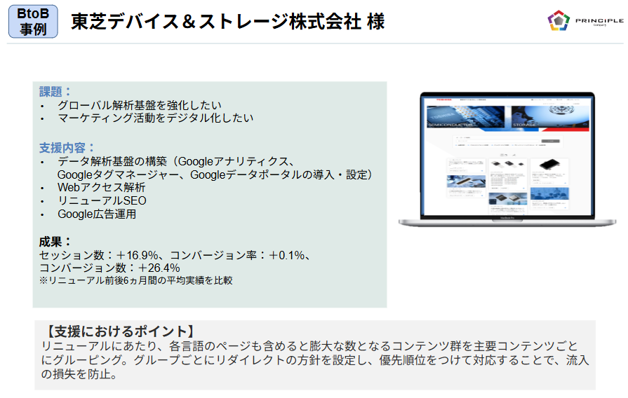 1つ目は東芝デバイス&ストレージ株式会社様の事例で、弊社のサイトでも紹介しております。SEOの観点から現状把握から成果検証まで、リニューアルの全ての工程をご支援させていただきました。解析の観点では、定量調査やアンケート調査を実施し、GA、GTM、Looker Studio(当時はGoogleデータポータル)の導入設定も全てご支援いたしました。