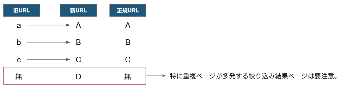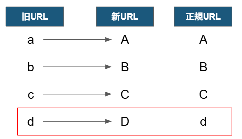上記の図に示すように、AからDのページは元々旧サイトにも存在していたため、リニューアル後はカノニカルタグ内のURLを新サイトのURLに変更する必要があります。しかし、Dの箇所のみ変更を失念し、旧サイトのURLが残存してしまっています。