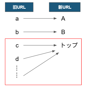 上記の図のAとBのように、リニューアル後にも該当する新しいページが存在するのであれば、新しいURLに切り替わります。旧サイトにあったページ(例:c、d)がリニューアル後になくなる場合、それらを一律にトップページへリダイレクトさせることは推奨しません。