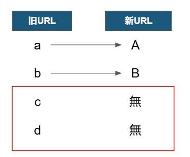aとbはリダイレクト設定をしているため、古い方のURLをクリックするとスムーズに新サイトの方へ案内されます。しかし、cとdはリダイレクトしていないため、古い方のURLをクリックすると、新サイトの方に案内されず「ページが見つかりませんでした」という404ページが表示されます。