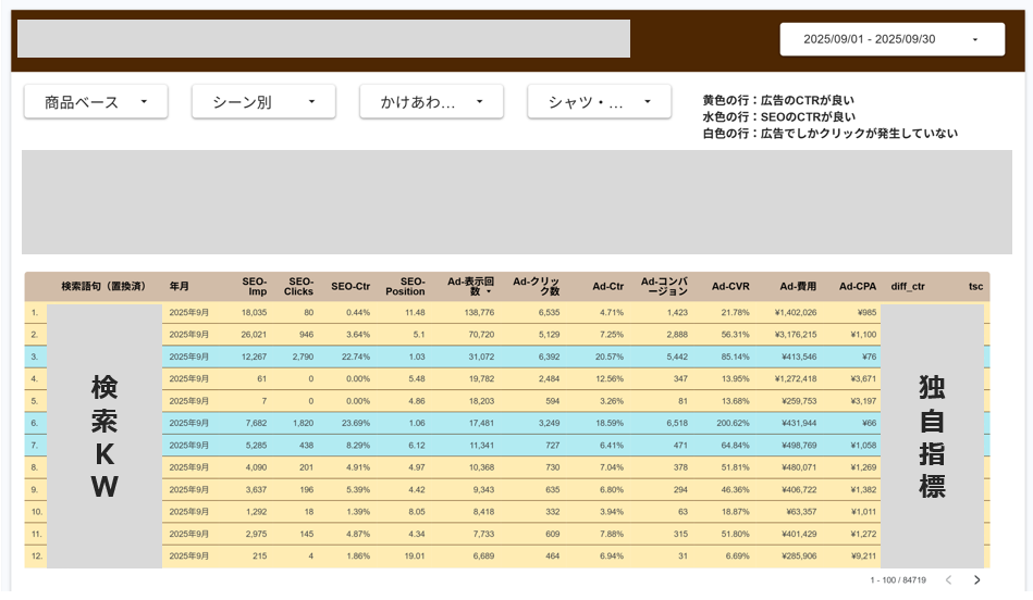 などを複合的にレポートし、独自指標による検索結果上のパフォーマンスを可視化します。横断的なキーワード戦略のデータとして活用できます。
