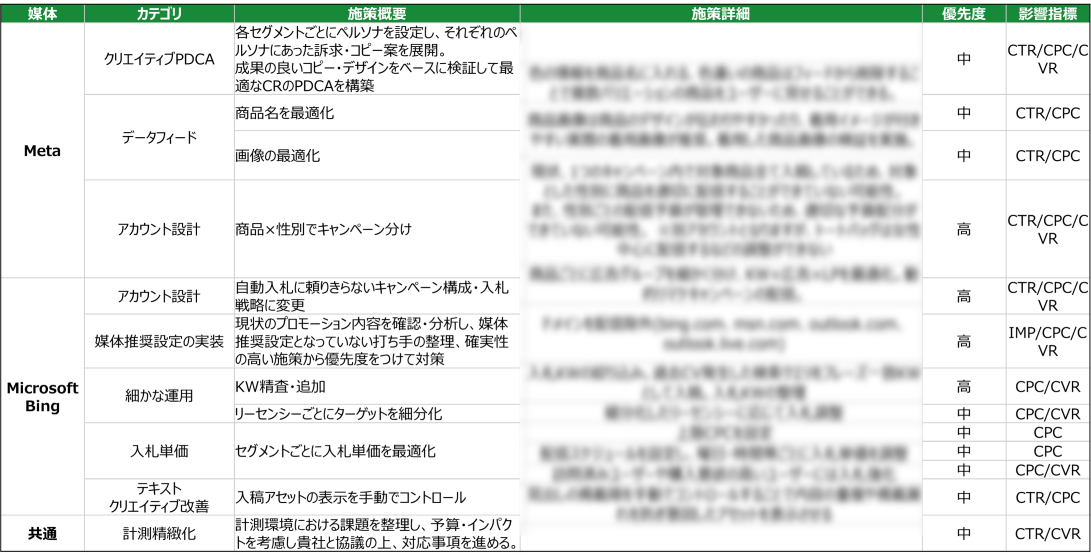 ペルソナを整理したうえで、クリエイティブ、広告アカウント設計、データフィードなどの現状を把握し、施策の方向性を整理してします。