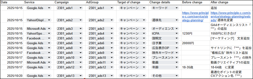 STEP1の戦略にもとづいて施策を実行します。媒体別、キャンペーン、広告グループ別に何をどのように設定変更したのか、運用ログを作成します。